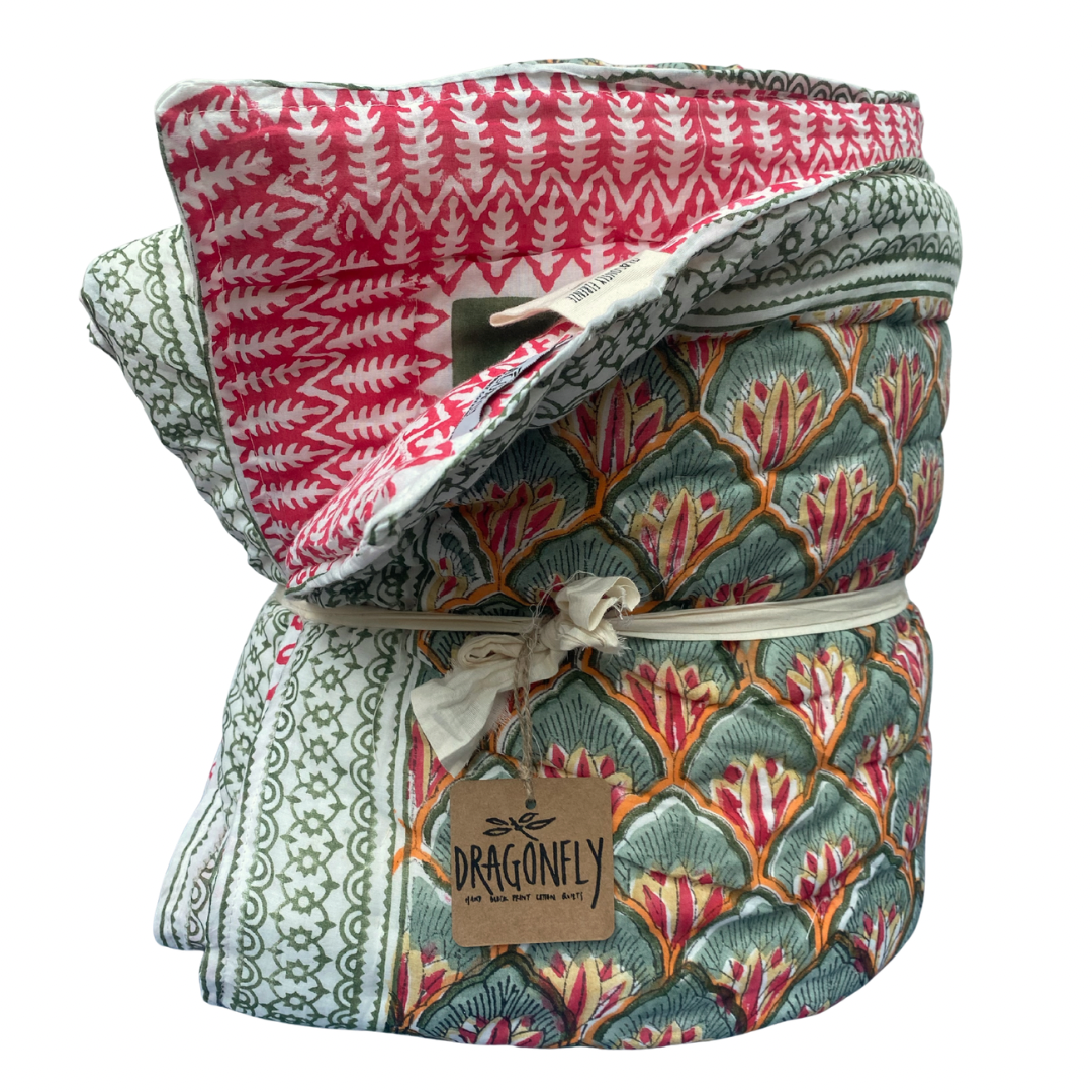 Warm and soft quilt in 100% cotton (also in the filling). Hand block print with floral motifs: lotus flowers in the colors of light blue, pink, sugar paper and brick on one side and another flowery fantasy in red on the other, the designs are inspired by the famous LOTUS GATE one of the many gates of Jaipur the 'pink city'.