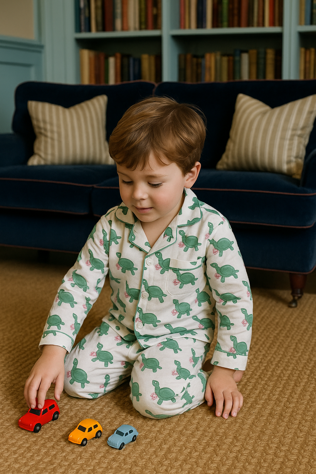 In puro cotone il pigiamino tartarughe e fiori è stampato a mano con la tecnica hand block su pura garza di cotone traspirante. Perfettamente rifiniti e confezionati uno ad uno, i pigiami ricalcano il modello classico, con la giacchina a reverse con l'abbottonatura sul fronte e le maniche lunghe. I pantaloni, anche questi lunghi, hanno un morbido elastico in vita i bottoni di pigiami sono in vero legno di cocco, la sacchettina nello stesso tessuto coordinato è inclusa.